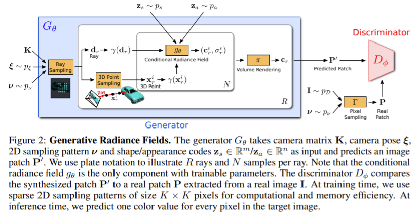 이 논문에서 사용한 모델의 구조는 위와 같다. Generator는 camera matrix K, camera pose E, 2D sampling pattern V, shape/appearance code를 입력을 받고, image patch P'을 예측하게 된다.
