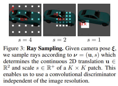 PatchGAN에서 사용하는 discriminator와 유사하다. 다만, GRAF는 u와 s의 값을 계속해서 변경하는 반면에, PatchGAN은 s= 1로 고정하여 사용한다는 차이점이 있다. 또한, GRAF는 s를 기반으로 이미지를 downsampling을 하지 않고, high-frequency detail을 확보하기 위해서, 이미지를 sparce location에 query하게 된다.