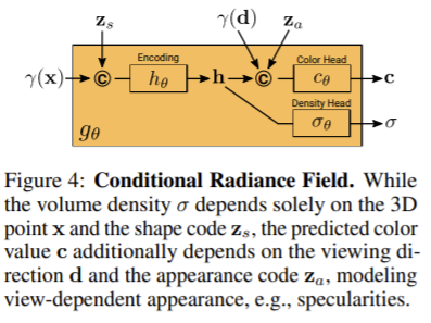 Apperance로부터 shape를 disentangle하면서 multi-view consistency를 높이기 위해서, σ를 viewpoint d와 appearnce code za로부터 독립적으로 계산한다.